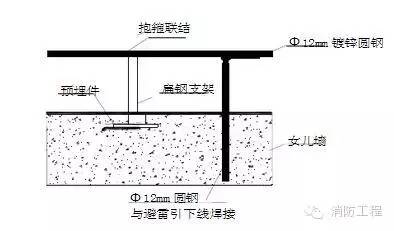 1.首先在屋面結構鋼筋綁扎時,從避雷引下線柱鋼筋引出Φ12mm鍍鋅圓鋼與屋面避雷帶連接,其接點做法見圖: