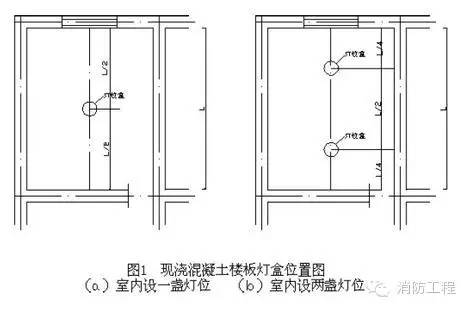 ⑴在配管前應按設計圖紙確定好配電設備、各種箱、盒及用電設備位置。在樓板內配管時,在土建摸板支設完畢后,根據設計圖紙在摸板上用紅油漆標注燈具、插座、探測器、接線盒、配電箱的位置。當室內只有一盞燈時,其燈位盒應設在縱橫墻(或梁)凈尺寸中心線的交叉處;有兩盞燈時,燈位盒應設在短軸線墻(或梁)凈尺寸中心線與長軸線墻(或梁)凈尺寸1/4 的交叉處,如圖1 所示。公共建筑走廊照明燈具,應按其頂部建筑結構不同,來合理地布置燈位盒的位置,當走廊頂部無凸出樓板下部的梁時,除考慮好樓梯對應處的燈位盒外,其他燈位盒宜沿走廊中心線均勻分布,如走廊頂部有凸出樓板下部的梁,確定燈位時,應考慮到燈位與梁的位置關系,燈位盒與梁之間的距離應協調,均勻一致,力求實用美觀。
