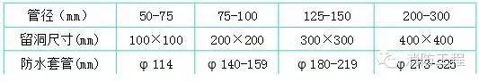 3.嚴格按照標準圖集加工制作防水套管、穿墻套管,套管長度按結構施工圖尺寸確定,套管管徑參照下列標準: