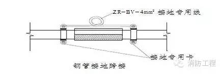 4.鋼管絲扣連接時在管接頭的兩端裝設專用接地跨接線,如圖。