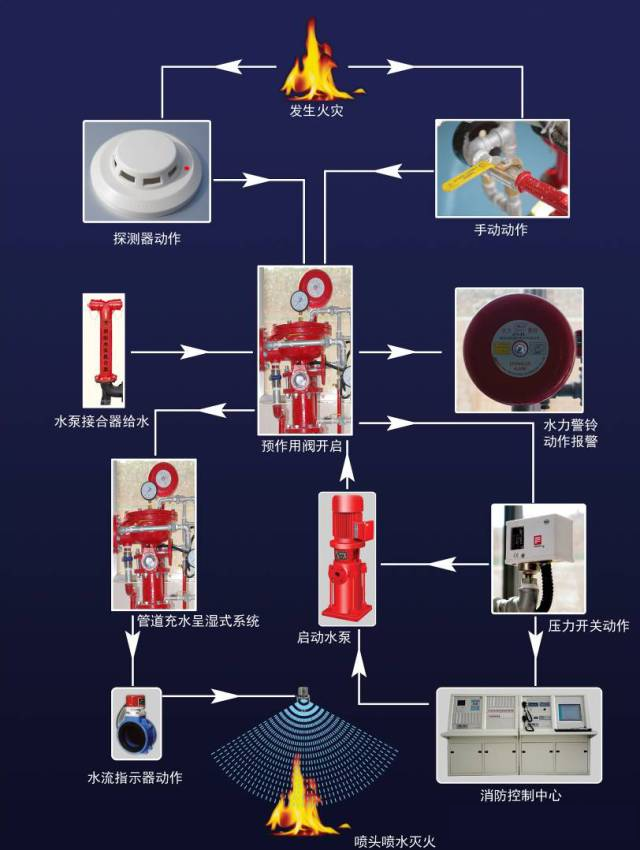保護區域出現火警時,探測系統首發動作,打開預作用雨淋閥以及系統中用于排氣的電磁閥(出口接排氣閥),此時系統開始充水并排氣,從而轉變為濕式系統,如果水勢繼續發展,閉式噴頭開啟噴水,進行滅火。這樣就克服了雨淋系統會因探測系統誤動作而導致誤噴的缺陷。