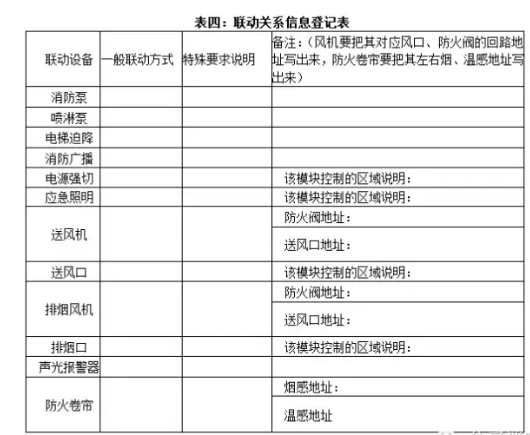 聯(lián)動(dòng)關(guān)系簡(jiǎn)要說(shuō)明表,如有特殊要求寫(xiě)明,請(qǐng)?jiān)趥渥?nèi)把要求內(nèi)容填全。要把所有聯(lián)動(dòng)控制設(shè)備一一羅列出來(lái)。