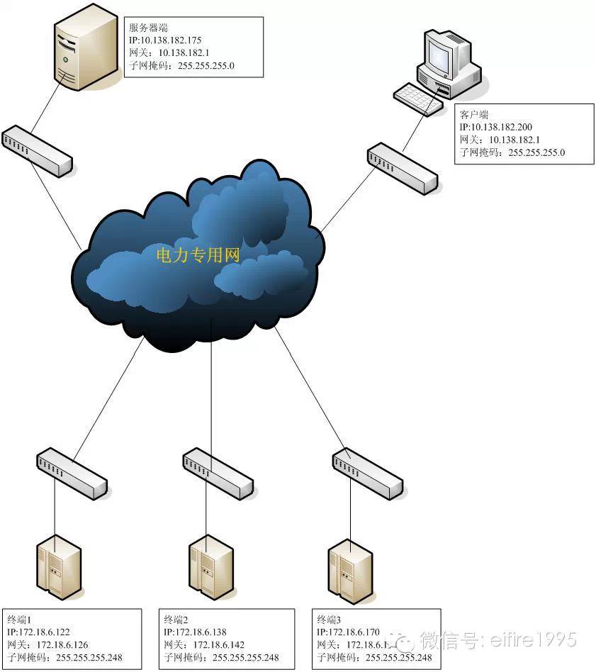 到達現場后,供電公司給出了如下圖所示的三個終端網絡參數、一個服務器端網絡參數、一個客戶端網絡參數(具體網絡結構尚不清楚,初步簡化為下圖)。