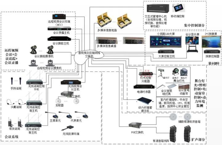 大會議室/多功能廳滿足會議、指揮、監控、展示、分析、匯報、小型報告會、演出等8大使用需求,中型會議室/小會議室滿足展示、分析、匯報、會議等4大使用需求。系統采用網絡式架構、包括大屏幕顯示、集中控制系統、視頻會議系統、擴聲系統、無線視頻分享系統、會議簽到系統、會議錄播系統、舞臺燈光系統、動力環境監測。