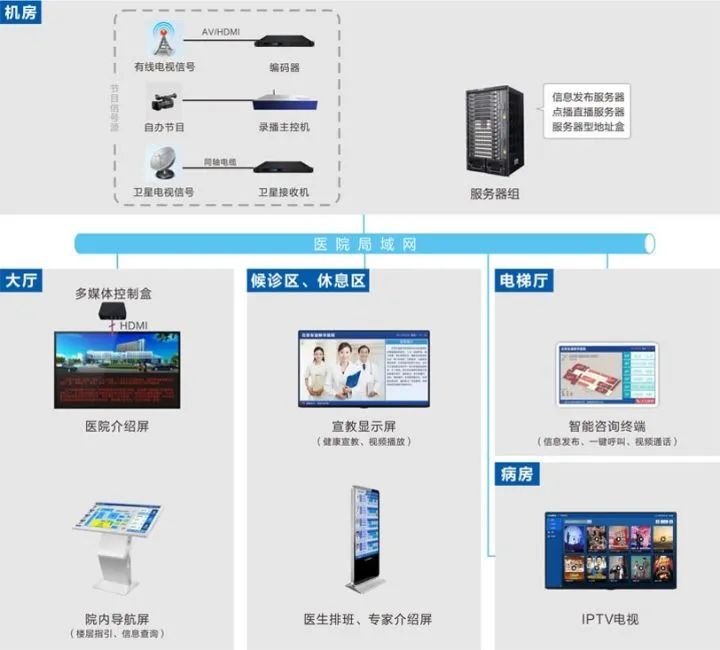 系統采用6類網線,網絡式架構;每病房設置1臺IPTV電視;電梯前室設置1臺信息發布一體機;候診區設置IPTV電視及信息發布一體機,門診樓和住院樓的一層大廳,設置P2.5小間距LED大屏及自助查詢一體機、門診樓設置LED大屏、LED條屏,西門、連廊處通道門設置LED條屏。