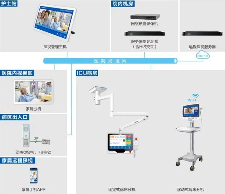 ICU病房探視系統連接于醫院內網,設置于住院樓六層ICU病房區,ICU病房區采用移動式病房分機。