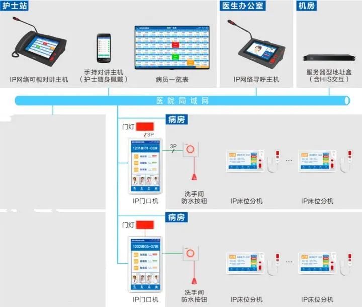 系統采用網絡式架構;病房每個床頭設置1臺IP床位分機,洗手間設置防水按鈕;每個病房門口設置1臺IP門口機;護士站設置對講主機和顯示屏;醫生辦公室設置對講主機。
