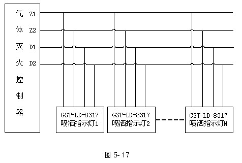 噴灑燈與氣體滅火控制器的總線和電源DC24V相連,實現噴灑噴灑功能。具體連接方法如圖5-17所示。