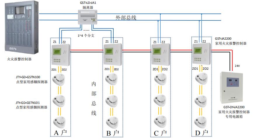 GST海灣家用火災安全系統 A 類設計中,隔離器為必選件,不占地址,將回路中家用探測器按規劃進行地址分配。