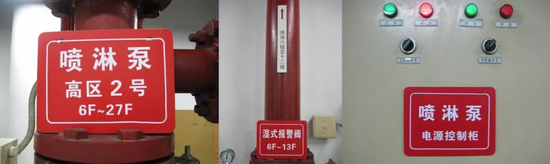 設置要求:水泵、報警閥、控制柜等標牌應為紅底白字,標明編號、所管樓層范圍、水流方向等相關內容。