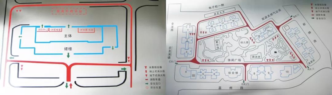 設置要求:在建筑大門口左側或住宅小區(廠區、庫區)主入口處的醒目位置應設置XX建筑消防總平面布局圖。主要包括建筑(住宅小區、廠區、庫區等)總平面布局圖、消防車道、撲救面、室外消火栓、水泵結合器、消防控制室位置、建筑通向室外的主要出口、以及住宅小區(廠區、庫區等)通向外部的出入口等內容。