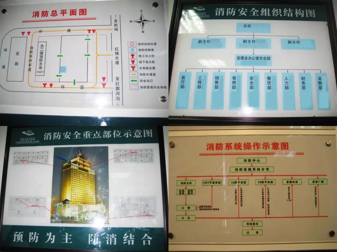 建筑消防總平面布局圖、消防安全組織機構圖、消防系統操作流程示意圖、消防安全重點部位示意圖。