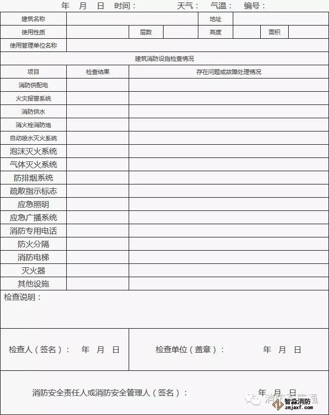3、情況正常在“檢查結果”欄中標注“正常”;發現的問題或存在故障應在“存在問題或故障處理情況”欄中填寫,并及時處置;當場不能處置的要填報《建筑消防設施故障處理記錄》;其他需要說明的情況在“檢查說明”欄填寫。