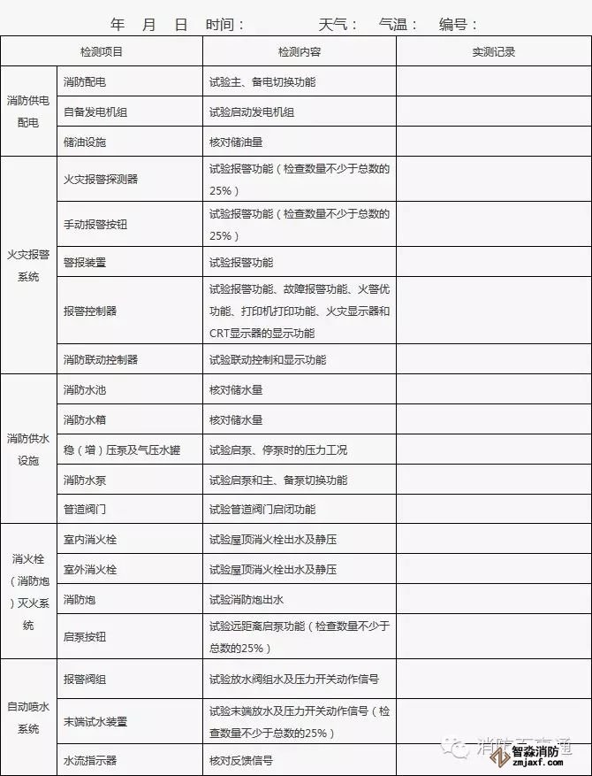 3、發現的問題或存在故障在“實測記錄”欄中填寫,并及時處置;當場不能處置的要填報《建筑消防設施故障處理記錄》。