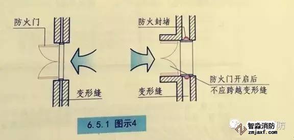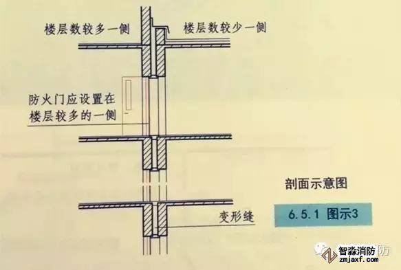 5.設置在建筑變形縫附件時,防火門應設置在樓層較多的一側【圖示3】,并應保證防火門開啟時門扇不跨越變形縫?!緢D示4