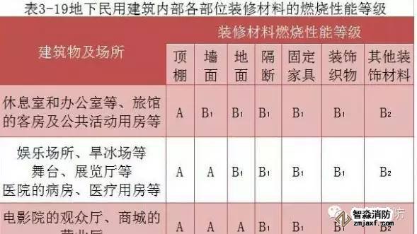 2.地下民用建筑內部各部位裝修材料的燃燒性能等級,不應低于表3-19的規定。