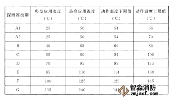 注:表中A1、A2、B、C、D、E、F、G為點(diǎn)型感溫探測(cè)器的不同類別,其具體參數(shù)應(yīng)符合附錄一的規(guī)定。