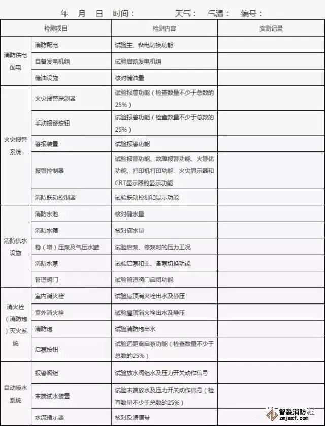 2、發(fā)現(xiàn)的問題或存在故障應在實測記錄欄中填寫,并及時處置;當場不能處置的要填報《建筑消防設施故障處理登記表》;