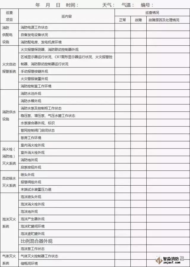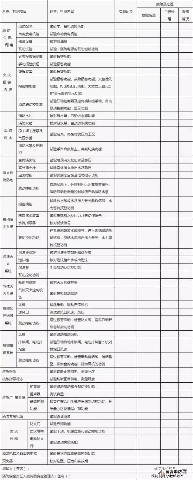 1、建筑消防設施巡查應明確各類建筑消防設施巡查部位,巡查應當每周至少一次,并填表。依法開展每月防火巡查的單位和設有電子巡查更系統(tǒng)的單位,應將建筑消防設施巡查部位納入其中。