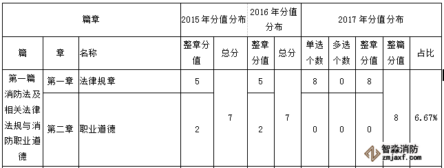 2017年一消綜合能力考試,第一篇所占分值為8分,每個章節所占分值發生了變化,第二章未出相關考點,而第一章法律規章所占分值為8分。