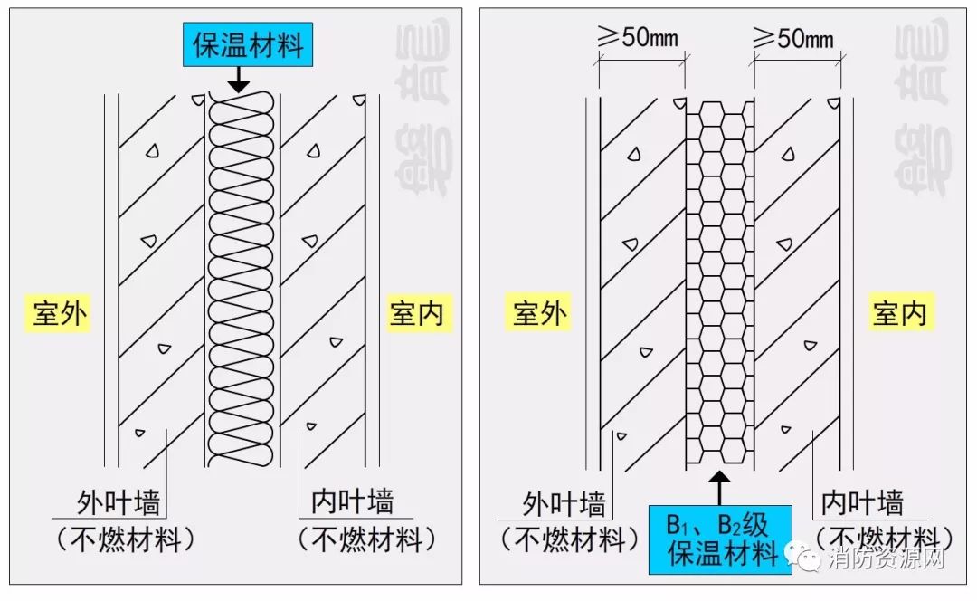當(dāng)保溫材料的燃燒性能為B1、B2級(jí)時(shí),保溫材料兩側(cè)的不燃材料墻體厚度均不應(yīng)小于50mm。