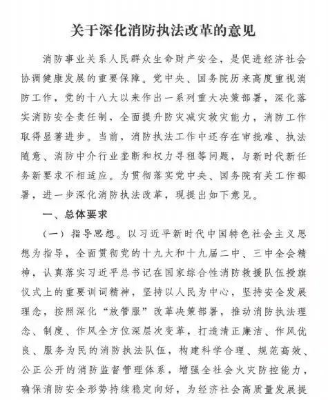 《意見》指出,深化消防執法改革的指導思想是:以習近平新時代中國特色社會主義思想為指導,全面貫徹黨的十九大和十九屆二中、三中全會精神,認真落實習近平總書記在國家綜合性消防救援隊伍授旗儀式上的重要訓詞精神,堅持以人民為中心,堅持安全發展理念,按照深化“放管服”改革決策部署,推動消防執法理念、制度、作風全方位深層次變革,打造清正廉潔、作風優良、服務為民的消防執法隊伍,構建科學合理、規范高效、公正公開的消防監督管理體系,增強全社會火災防控能力,確保消防安全形勢持續穩定向好,為經濟社會高質量發展提供安全保障。