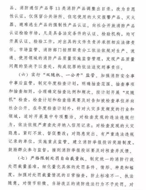 在簡政放權方面,取消和精簡3項消防審批。一是取消消防技術服務機構資質許可,取消消防設施維護保養檢測、消防安全評估機構資質許可制度,企業辦理營業執照后即可開展經營活動。二是簡化公眾聚集場所投入使用、營業前消防安全檢查,實行告知承諾管理,公眾聚集場所作出其符合消防安全標準的承諾后即可投入使用、營業。三是放寬消防產品市場準入限制,將強制性產品認證目錄中的13類消防產品調整出目錄,改為自愿性認證,僅保留公共場所、住宅使用的火災報警產品、滅火器、避難逃生產品的強制性產品認證;向社會開放消防產品認證、檢驗市場,凡是具備法定條件的認證、檢驗機構,均可開展認證、檢驗工作。消防部門制定消防技術服務機構從業條件和服務標準、公眾聚集場所消防安全標準,引導加強行業自律、規范從業行為,加強監督抽查,依法懲處違法違規行為,對嚴重違法違規的實行行業退出、永久禁入或者責令停止使用、營業。