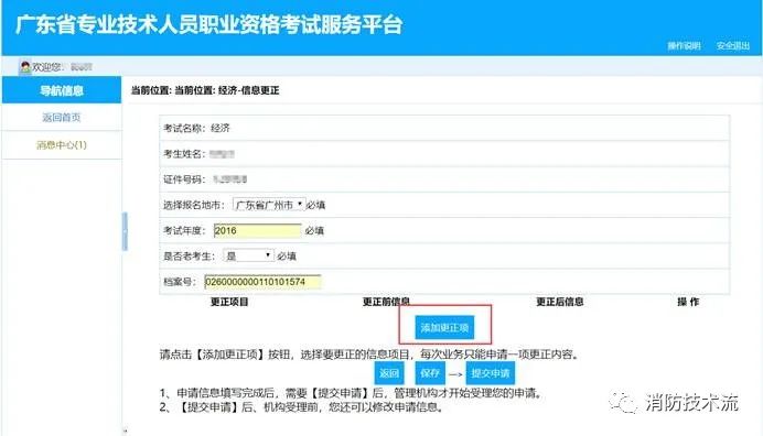 2.增加更正項(xiàng)。辦理信息更正業(yè)務(wù)時(shí),可添加多條更正項(xiàng)。點(diǎn)擊【添加更正項(xiàng)】按鈕,選擇更正項(xiàng),更正前信息、更正后信息,并保存。管理員受理前,可以對(duì)更正項(xiàng)內(nèi)容進(jìn)行修改、刪除、補(bǔ)充更正證明材料等操作。