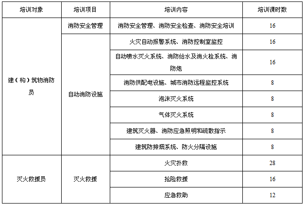 (5)第一類社會消防安全培訓機構的理論教員和實操教員應參加省級以上公安機關消防機構或行業協會組織的專業技術培訓,其內容和課時應符合下表的要求。