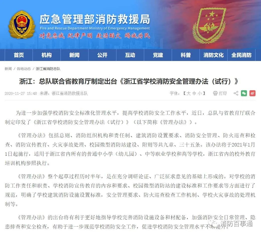 為進一步加強學校消防安全標準化管理水平,提高學校消防安全工作水平,近日,總隊與省教育廳聯合制定印發(fā)了《浙江省學校消防安全管理辦法(試行)》(以下簡稱《管理辦法》)。