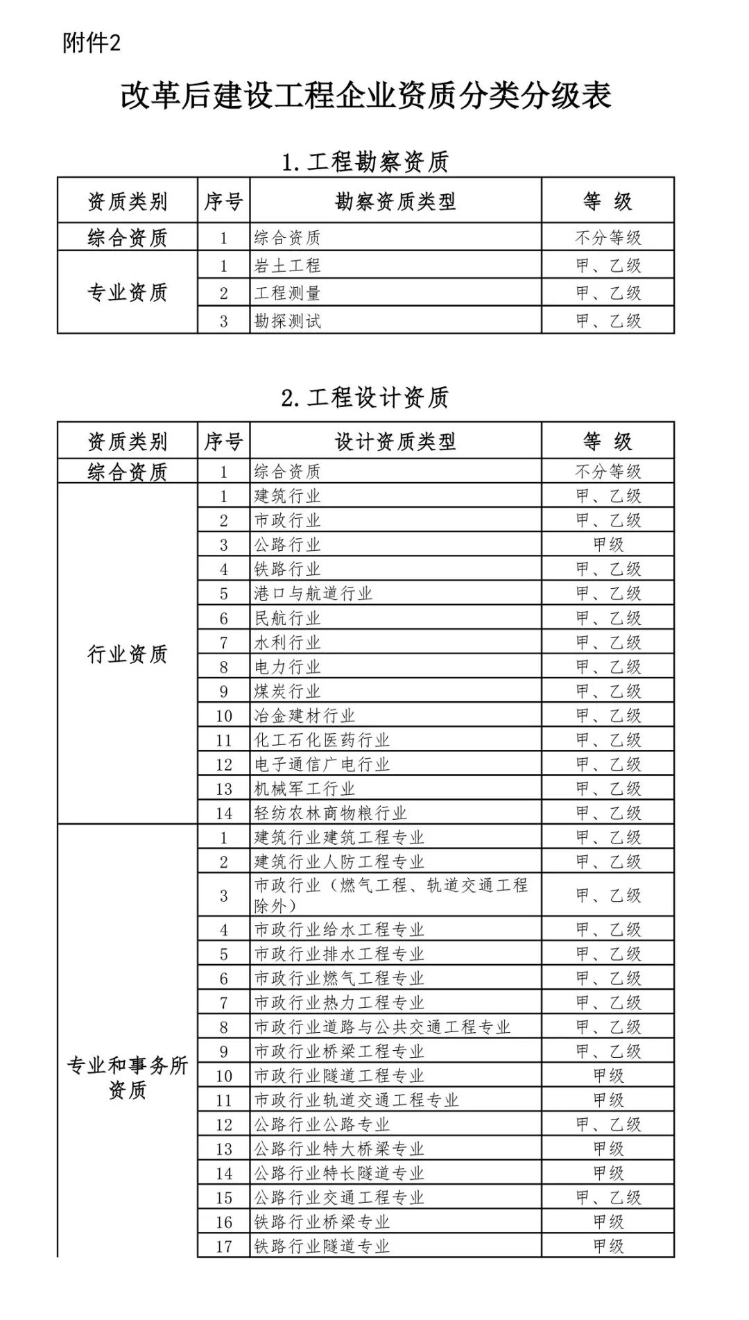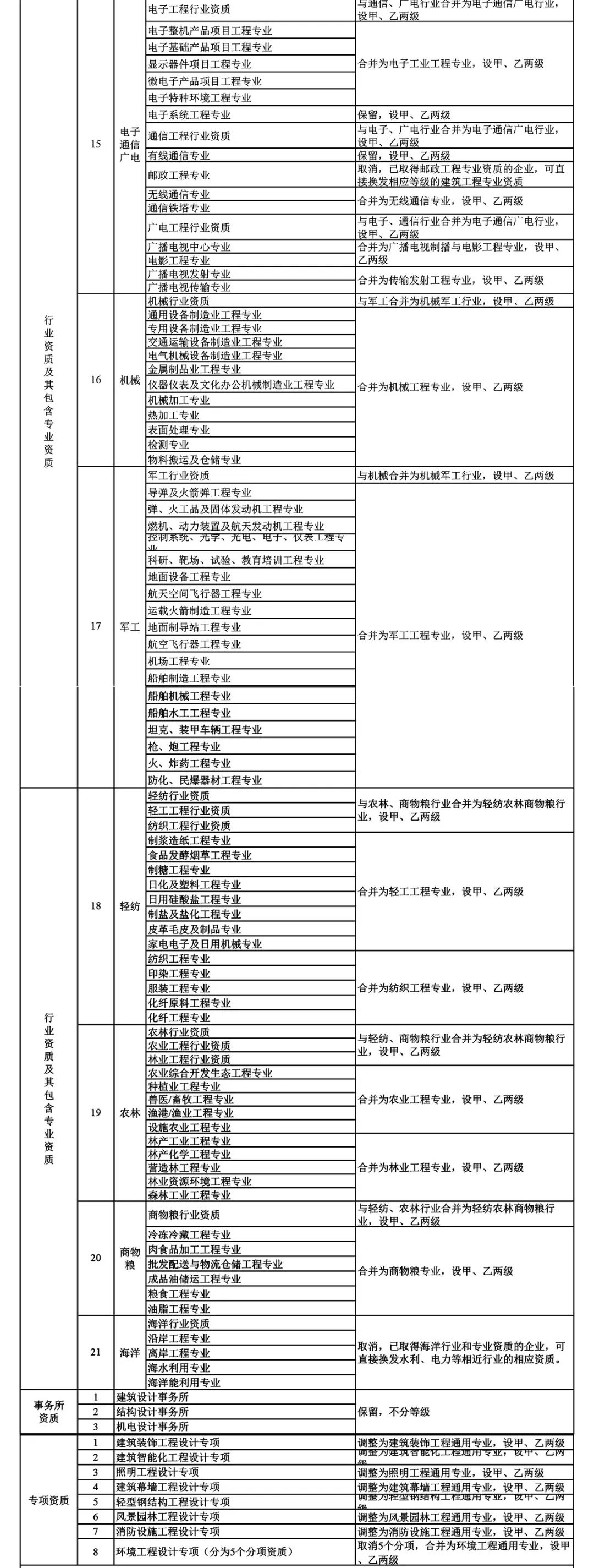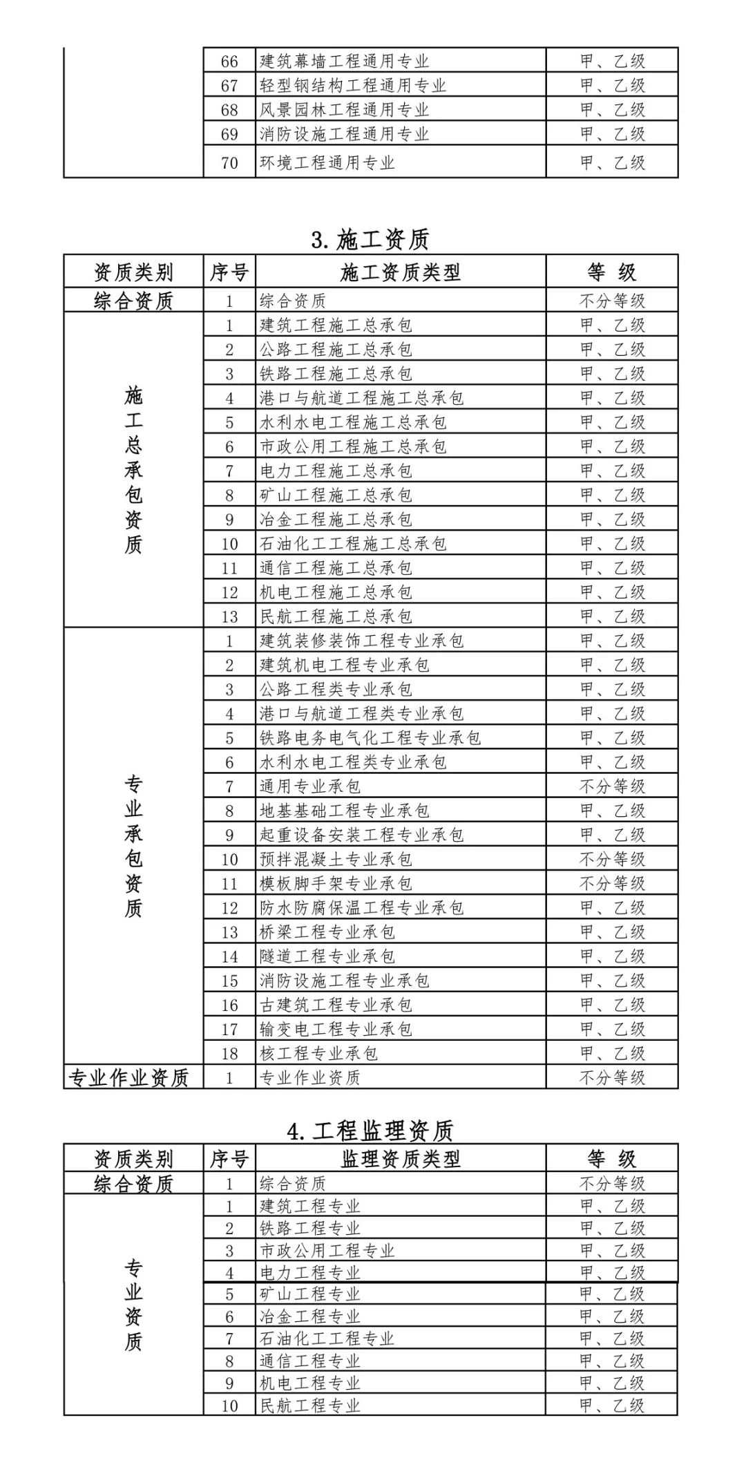 2.工程設計資質。保留綜合資質;將21類行業(yè)資質整合為14類行業(yè)資質;將151類專業(yè)資質、8類專項資質、3類事務所資質整合為70類專業(yè)和事務所資質。綜合資質、事務所資質不分等級;行業(yè)資質、專業(yè)資質等級原則上壓減為甲、乙兩級(部分資質只設甲級)。