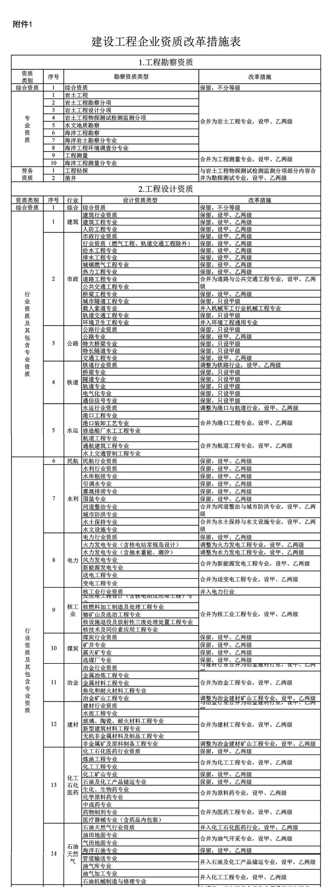 (一)精簡資質類別,歸并等級設置。為在疫情防控常態(tài)化條件下做好“六穩(wěn)”工作、落實“六保”任務,進一步優(yōu)化建筑市場營商環(huán)境,確保新舊資質平穩(wěn)過渡,保障工程質量安全,按照穩(wěn)中求進的原則,積極穩(wěn)妥推進建設工程企業(yè)資質管理制度改革。對部分專業(yè)劃分過細、業(yè)務范圍相近、市場需求較小的企業(yè)資質類別予以合并,對層級過多的資質等級進行歸并。改革后,工程勘察資質分為綜合資質和專業(yè)資質,工程設計資質分為綜合資質、行業(yè)資質、專業(yè)和事務所資質,施工資質分為綜合資質、施工總承包資質、專業(yè)承包資質和專業(yè)作業(yè)資質,工程監(jiān)理資質分為綜合資質和專業(yè)資質。資質等級原則上壓減為甲、乙兩級(部分資質只設甲級或不分等級),資質等級壓減后,中小企業(yè)承攬業(yè)務范圍將進一步放寬,有利于促進中小企業(yè)發(fā)展。具體壓減情況如下: