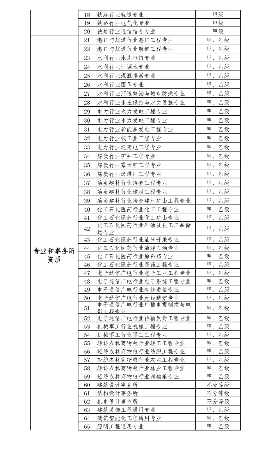 4.工程監(jiān)理資質。保留綜合資質;取消專業(yè)資質中的水利水電工程、公路工程、港口與航道工程、農林工程資質,保留其余10類專業(yè)資質;取消事務所資質。綜合資質不分等級,專業(yè)資質等級壓減為甲、乙兩級。