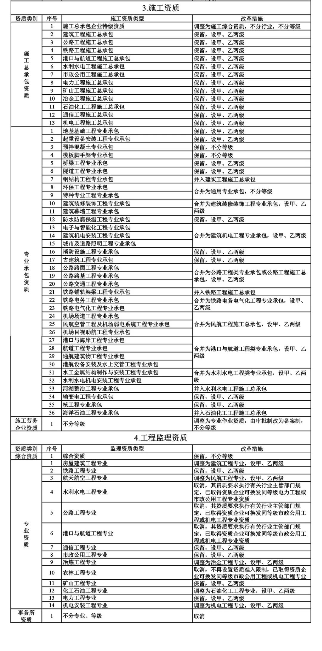 3.施工資質。將10類施工總承包企業(yè)特級資質調整為施工綜合資質,可承擔各行業(yè)、各等級施工總承包業(yè)務;保留12類施工總承包資質,將民航工程的專業(yè)承包資質整合為施工總承包資質;將36類專業(yè)承包資質整合為18類;將施工勞務企業(yè)資質改為專業(yè)作業(yè)資質,由審批制改為備案制。綜合資質和專業(yè)作業(yè)資質不分等級;施工總承包資質、專業(yè)承包資質等級原則上壓減為甲、乙兩級(部分專業(yè)承包資質不分等級),其中,施工總承包甲級資質在本行業(yè)內承攬業(yè)務規(guī)模不受限制。