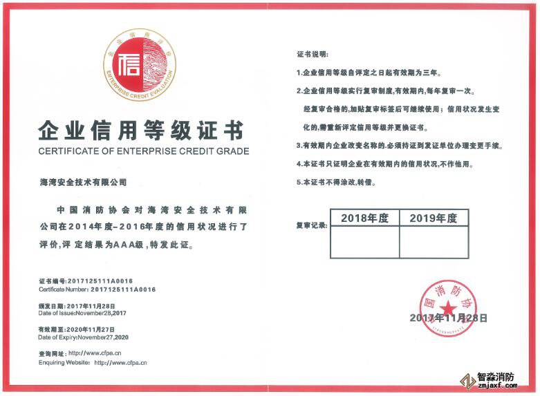 海灣消防公司再次獲評消防行業AAA級信用企業稱號
