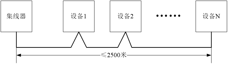 布線(xiàn)方式建議采用手拉手方式,可采用T形布線(xiàn),N≤109。其中集線(xiàn)器與設(shè)備N(xiāo)需要配置匹配電阻,其他設(shè)備不配置匹配電阻。